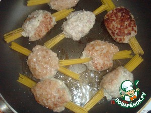 Приготовить фарш, добавить измельченный лук, приправить по вкусу. Берем небольшой шарик фарша, делаем из него лепешку в руке, выкладываем на лепешку штук 10-15 спагетти (поломанных пополам) так, чтобы концы торчали и облепливаем макарошки фаршем, придавая округлую форму. В глубокой сковороде растопить масло и уложить наших "осьминожек", добавить кетчуп, залить горячей водой, чтобы покрыла наших "животных". Тушить 15 мин.