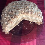 Каждый корж мажем нашей начинкой. Под конец надо будет вылить все, что осталось с верху на торт.