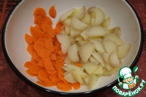 Свеклу, морковь и картофель отварить, охладить и очистить. Нарезать тонкими ломтиками. В миску выложить картофель с морковью.
