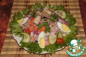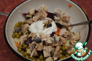 Рыбу вынуть из банки и нарезать мелкими кусочками (несколько кусочков оставить для украшения). Добавить к овощам, заправить майонезом или сметаной.