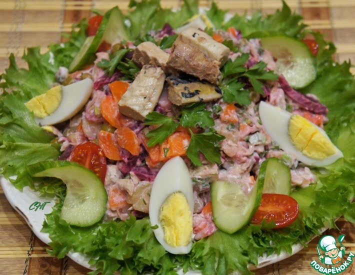 Вкусный салатик. Из-за свеклы немного напоминает винегрет, но это не удивительно: присутствие свеклы меня лично всегда наводит на мысль о винегрете:)))