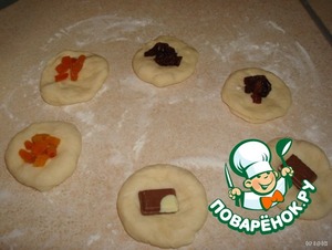 После того, как тесто постоит, мы берем и отрываем кусочки, одинаковые по размеру. Каждый кусочек разминаем в лепешку и кладём на нее начинку. -