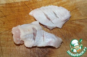 Подготовить крылья. Концы крыльев не используем, потом бросим в суп, на остальных частях делаем надрезы.