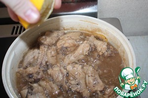 Выложить в сковороду оставшийся маринад, добавить воду и тушить под крышкой на среднем огне пока не выпарится большая часть маринада.