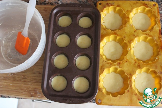 Вылить тесто в смазанную маслом форму. Поскольку я не хотела рисковать и печь толстый пирог (День Рождения все-таки!), я использовала 1/3 теста для маленьких кексиков.