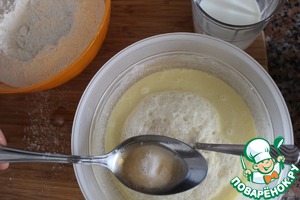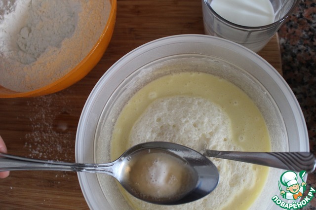 Поскольку я вспомнила про соду только после первого раунда добавления муки и молока, то я добавила соду и уксус на данном этапе. Тесто еще достаточно жидкое, и сода хорошо пошла.