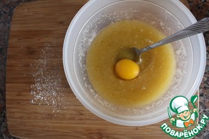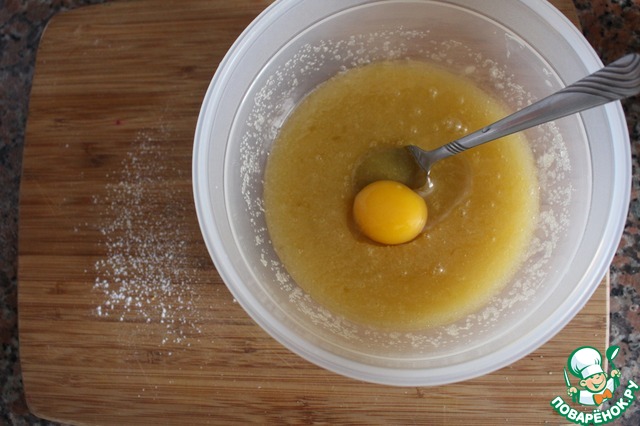 Добавить одно яйцо и хорошо взбить, добавить второе яйцо и снова взбить.