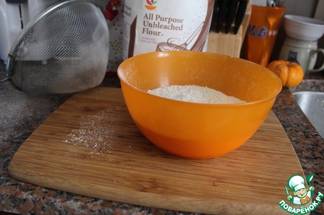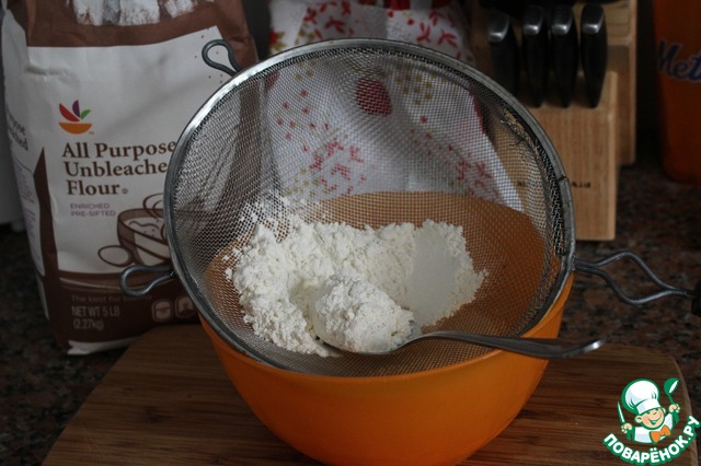 Просеять муку. Требуется отмерить 1.5 чашки муки уже в просеянном виде. Поскольку я терпеть не могу терять даже крупицы продуктов (спасибо бабушке, которая прошла голод войны, за науку), то я вышла из положения так: отмерила 1.5 чашки воды в миску, заметила уровень приблизительно, обсушила миску и просеяла муку в миску до этого уровня. На глазок вышло замечательно.