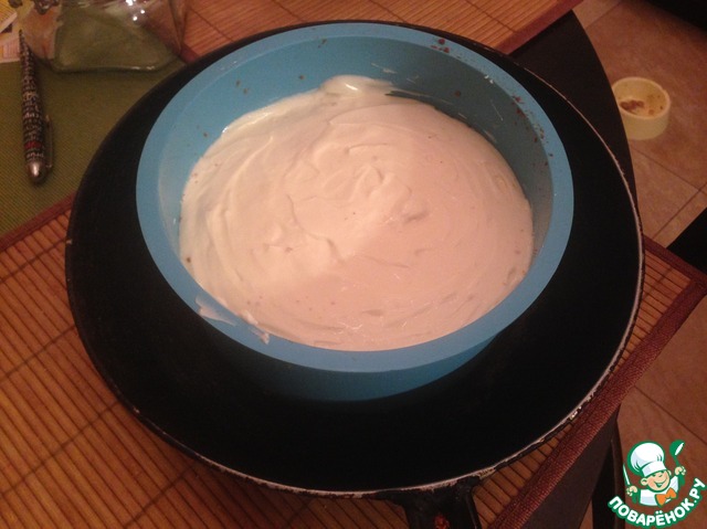Форму поставить в бОльшую форму с горячей водой и положить в духовку на 1 час 15 минут. -