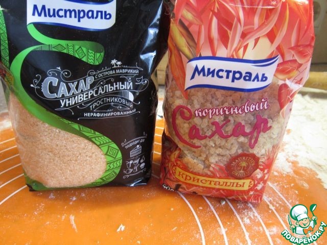 Берем две части, раскатываем их в лепешки, которые смазываем маслом и посыпаем сахаром (сахар может быть любым, я взяла коричневый тростниковый сахар кристаллы Мистраль).
