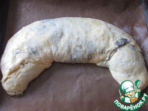 Рулет укладываем на противень, даем немного растронуться и выпекаем при температуре 200градусов до готовности.