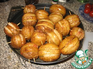 Затем достаём посудину и, стреляя глазами и афоризмами, обжигая и бесполезно плюя на пальцы, хватаясь за все уши в пределах досягаемости, перекладываем клубни на круглый противень для МВ. Опять-же –швом вверх!
