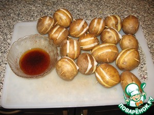 Делаем в клубне два параллельных надреза, не дорезая до противоположного края пару сантиметров. Вставляем в надрезы тонкий ломтик сала ( можно бекона). Смазываем солёным маслом, скрепляем зубочисткой,