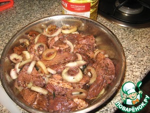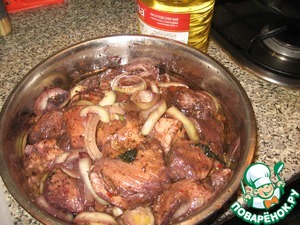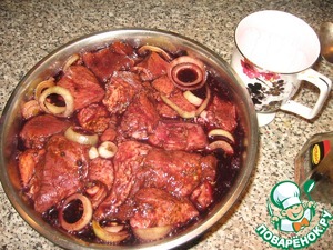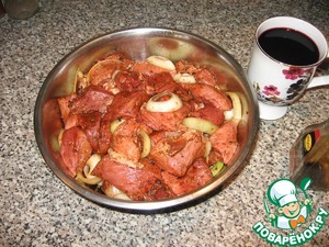 У меня всегда в бочках пять – шесть видов домашнего сухого вина и для тех у кого есть своё вино рекомендую Каберне или Одесский чёрный. Это то, чем я заливаю. Можно использовать Зайбер, Молдову, даже Баку. Только не берите десертные пахучие сорта. У кого своего вина нет берём в магазине Каберне или СУХОЕ красное вино и заливаем пару стаканчиков. Так, чтобы мясо почти скрылось в волнах алкогольной нирваны. Кстати по-поводу опасений о вредности всего этого великолепия нашим деткам. Поверьте, при приготовлении и употреблении в блюде не то, что вкуса, но даже запаха не будет. Мы его позже сольём, а остаток выпарится. Вино служит консервантом, в котором мясо может мариноваться двое-трое суток (проверено!!!), при перемешивании, не портясь и не перебирая с жёсткостью. Мясо можно использовать через час, а можно в ЭМАЛИРОВАННОЙ (стеклянной) посуде, поставить в багажник и забурится на море, вспомнив о нем на исходе следующего дня.