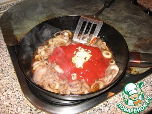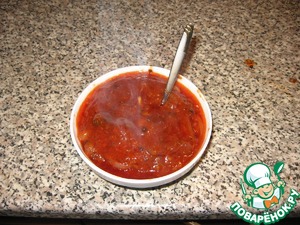 Добавляем к луку :- грамм 100 кетчупа «Чили»; грамм 100 кетчупа « Для Шашлыка»; чайную ложку молотого чёрного перца, столько-же красного, чеснок и,