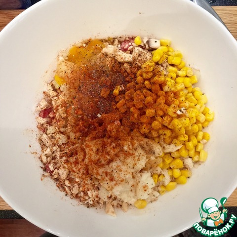 • Булку вымачиваем в воде. Половину грибов мелко рубим. В большом миске смешиваем фарш, кукурузу, мелко рубленые грибы, мелко нарезаный лук, яйцо, отжатую булку, соль, перец, кайенский перец, паприку. Тщательно вымешиваем.