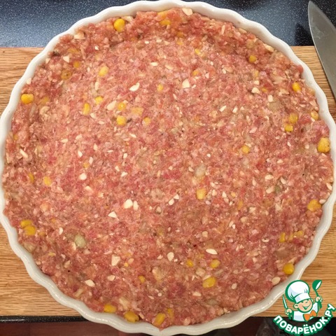 • Выкладываем фарш с небольшими бортиками по бокам.