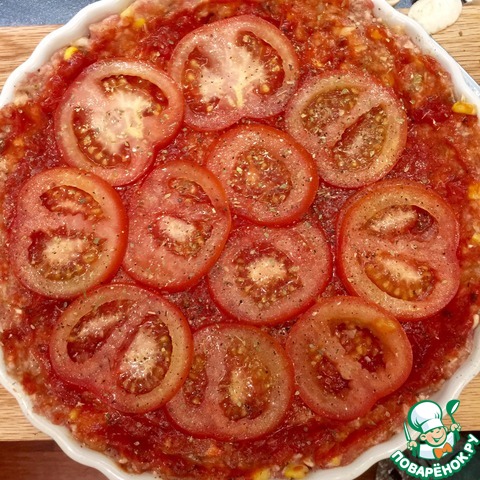 • Слайдами нарезаем помидоры и выкладываем сверху. Солим, перчим, посыпаем орегано.