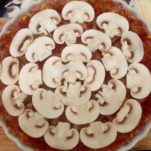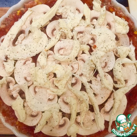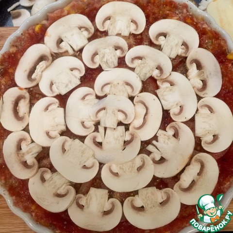 • Сверху выкладываем оставшиеся грибы, порезанные на тонкие пласты.