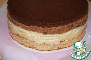 На корж сверху ровным слоем выложить немного крема "Жасмин" и поставить в холод для застывания (для того, чтобы "Пьяный орех" не лежал на корже, но это не принципиально). Затем сверху выложить "Пьяный орех" и выложить оставшийся крем и поставить в холод.