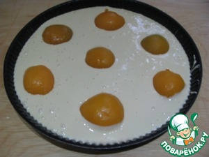 Форму смазать сливочным маслом вместе с бортиками, вылить тесто, разложить просушенные дольки персиков.