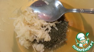 Чеснок потереть на мелкой терке, добавить сухие травки (у меня укроп и петрушка).