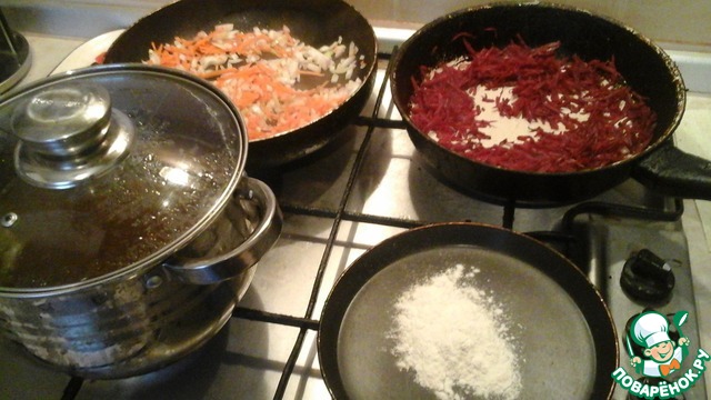Во второй - тушим свеклу, после чего разводим грибным бульоном, провариваем минут 10.
