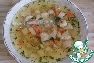 Бульон процеживаем. Грибы нарезаем на мелкие кусочки. В кипящий бульон добавляем капусту и картофель. Варим 15 минут.