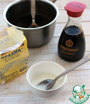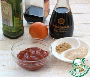 В сотейнике соединим 2 ст. л. соевого соуса Киккоман, 4 ст. л. бальзамического уксуса, 3 ст. л. кетчупа, 2 ст. л. коричневого сахара, 1 ч. л. имбиря, 50 мл апельсинового сока.