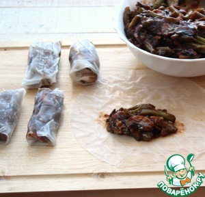 Опускаем рисовую бумагу на несколько секунд в воду и фаршируем в неё начинку из грибов и фасоли.