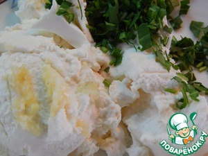 В мягкий творог (у меня рикотта) добавляем измельченный чеснок и мелко нарезанную рукколу. Аккуратно перемешиваем.