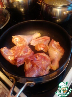 Итак, нагреваем как следует сковороду. На раскаленную сковороду кладем курицу. Поверьте она не прилипнет. Огонь поддерживаем сильный, курица должна как следует подрумяниться -