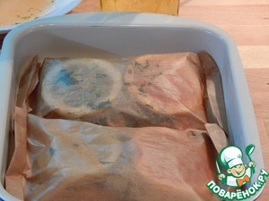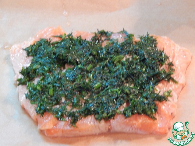 Для каждой порции приготовим бумагу для запекания. Выложим на нее рыбу, сверху укроп.