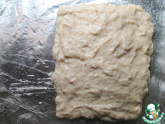 Распределяем фарш по фольге слоем толщиной в 1 см.