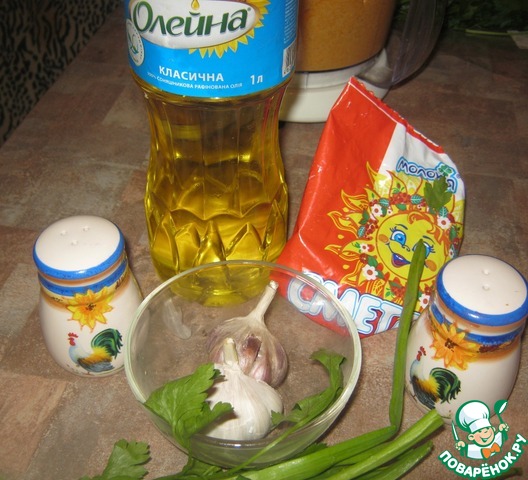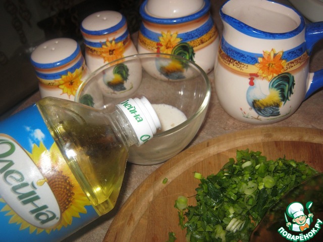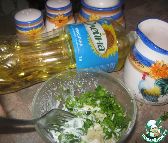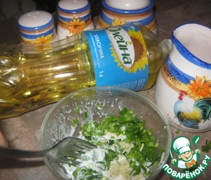 А пока готовим соус - смешиваем сметану, натёртый чеснок с маслом ТМ "Олейна" ( 3 ст. л.), режем зелень (зелёный лук)