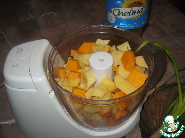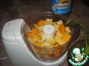 Картофель и тыкву режем на кусочки и измельчаем в чаше комбайна