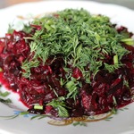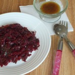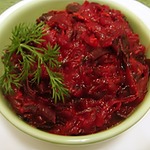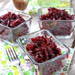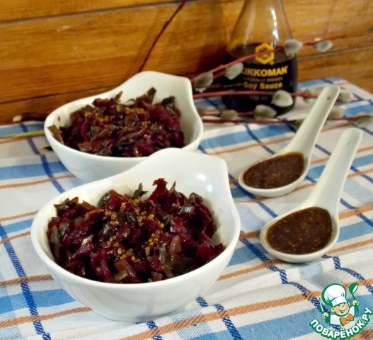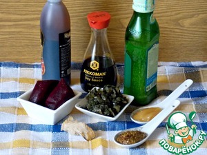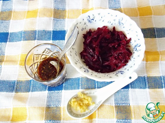Имбирь почистить и мелко порезать. В чашке смешать имбирь, соевый соус, мед, горчицу, масло и крем бальзамик. ( Если у вас нет крема бальзамика, то советую заменить его рисовым уксусом для суши ). Все хорошенько перемешать. Поперчить по вкусу. Если любите поострее, то добавьте тертый чеснок. Свеклу потереть на крупной терке.