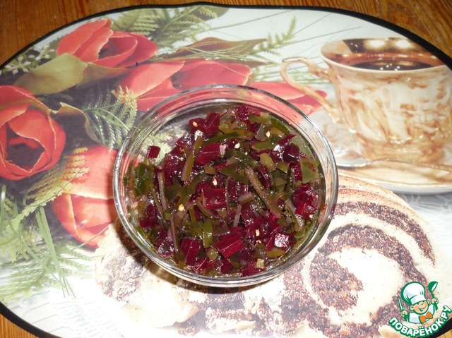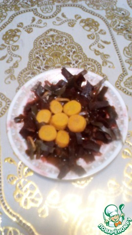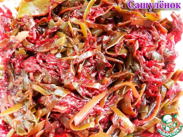 Морскую капусту смешать со свеклой. Заправить заправкой, дать постоять 10 мин. и можно кушать.