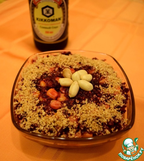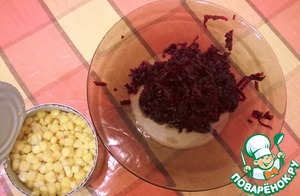 Отварную или запеченную свеклу натираем на крупной терке, добавляем полбаночки консервированной кукурузы, молотый арахис (отложив чуточку для украшения), измельченный на терке или в прессе зубочек чеснока.
