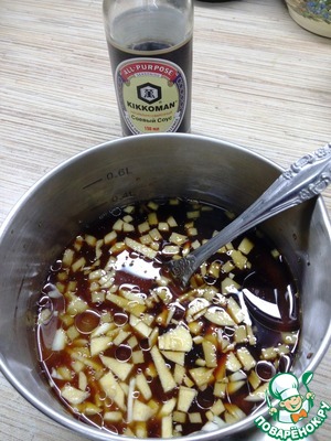 Приготовим соус Терияки. Вы можете взять готовый. В воде размешать крахмал. В небольшой кастрюльке смешать соевый соус, винный уксус, сахар, мед, оливковое масло, рубленный чеснок и имбирь. Можно чеснок пропустить через пресс, а имбирь натереть на терке. В последнюю очередь добавить разведенный крахмал. Поставить на медленный огонь и после закипания варить 4-5 минут