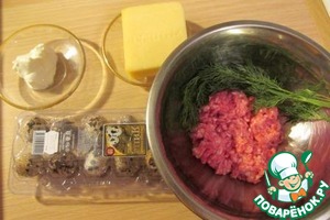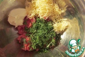 Сыр натираем, укроп измельчаем, вместе со сметаной и яйцом добавляем к фаршу, всыпаем мускатный орех, соль и перец.