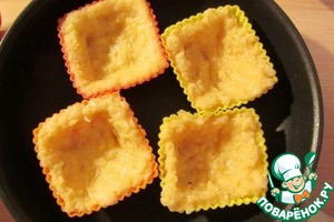 Рисовую массу выкладываем по дну и бокам формочек. Если формочки силиконовые, смазывать маслом их не будем; если металлические - смазываем маслом или прокладываем бумажными вставками.