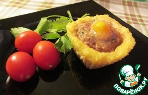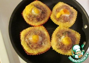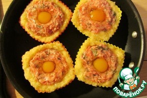 В фарше любым подручным инструментом или просто пальчиком делаем углубление, в которое аккуратненько разбиваем перепелиное яичко.