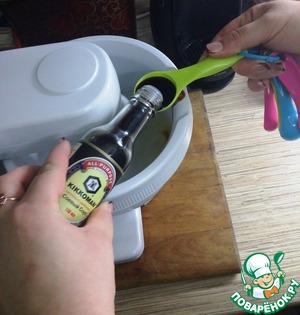 В теплой воде растворить соль и сахар. Добавить соевый соус.