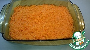 Морковь трем на специальной терке. Добавляем к ней уксус, соль и сахар. Слегка мнем руками, перемешиваем, уплотняем и оставляем на 90 минут.