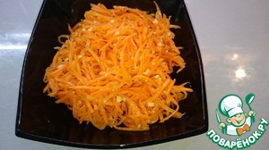 Маринованную морковь слегка отжимаем и сливаем образовавшуюся жидкость. Кладем в морковь чеснок, кориандр, кунжут и перец, перемешиваем.