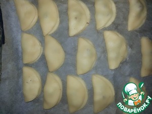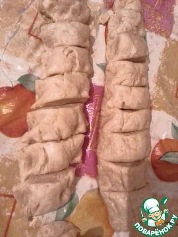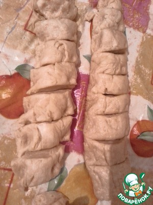 Раскатывпем тесто руками и делим пополам. Потом каждую режем на 9 равных кусочков. Получитья 18 штук
