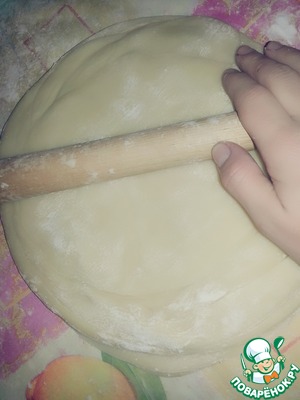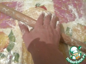 И раскатываем на посыпанной крахмалом столе в пласт, толщиной 6 мм. Так приступаем и со второй частью теста.