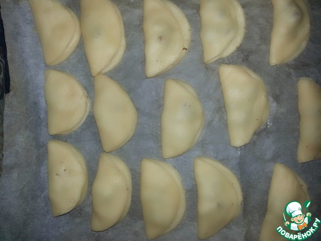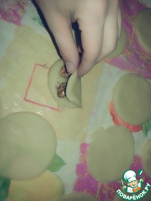 Потом достаём тесто, посыпать на стол крахмал и поочередно раскатываем сначала из шариков лепешки в размере блюдца.