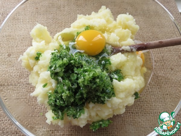 в пюре добавить яйца, зелень, посолить и поперчить по вкусу, перемешать.